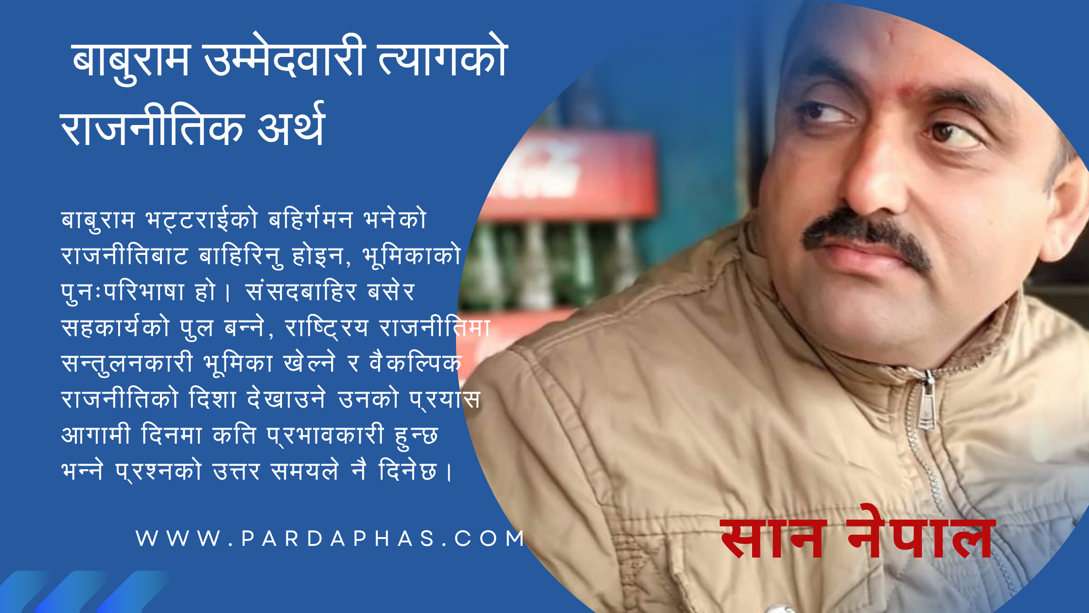 बाबुराम भट्टराईको बहिर्गमन भनेको राजनीतिबाट बाहिरिनु होइन, भूमिकाको पुनःपरिभाषा हो। संसदबाहिर बसेर सहकार्यको पुल बन्ने, राष्ट्रिय राजनीतिमा सन्तुलनकारी भूमिका खेल्ने र वैकल्पिक राजनीतिको दिशा देखाउने उनको प्रयास आगामी दिनमा कति प्रभावकारी हुन्छ भन्ने प्रश्नको उत्तर समयले नै दिनेछ। तर यति भने स्पष्ट छ, यो बहिर्गमनले नेपाली राजनीतिमा नयाँ बहस र नयाँ सम्भावनाको ढोका खोलेको छ।