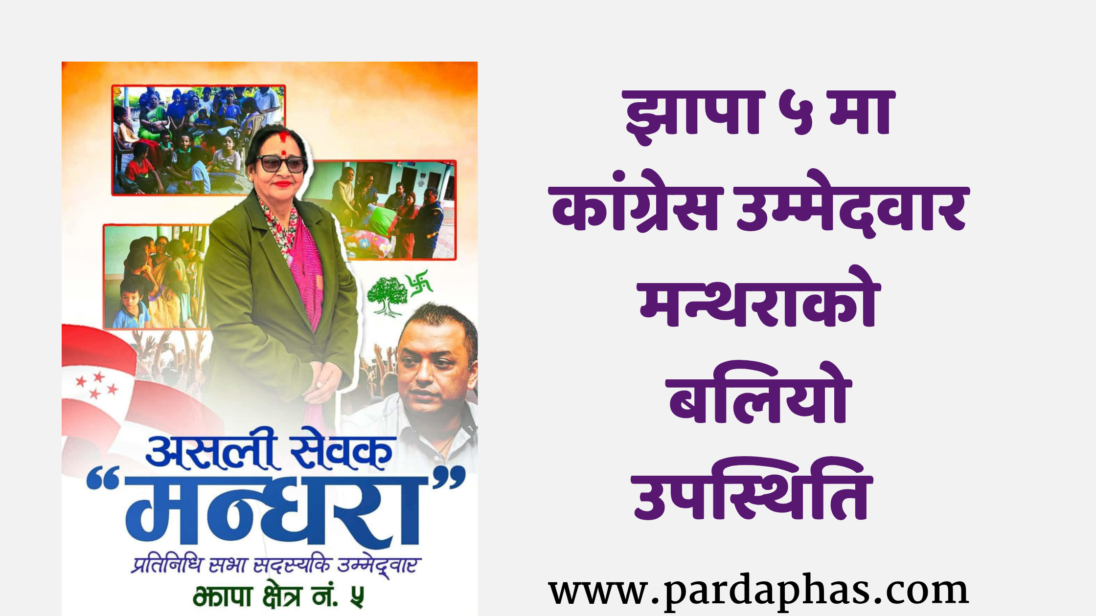 राजनीतिमा भीड देखाएर शक्ति प्रमाणित गर्ने चलन पुरानो भयो,अब विश्वास देखाएर नेतृत्व प्रमाणित गर्ने समय आएको छ। झापा क्षेत्र नं. ५ यतिबेला केवल एउटा निर्वाचन क्षेत्र मात्र होइन, देशको राजनीतिक बहसको केन्द्रबिन्दु बनेको छ। कारण:- नेपाली कांग्रेसले यहाँबाट अघि सारेकी एकल महिला उम्मेदवार, सामाजिक सेवामा जीवन अर्पण गरेकी, बिना दाग र बिना स्वार्थको पहिचान बनाएकी मन्धरा चिमरिया पौडेल।