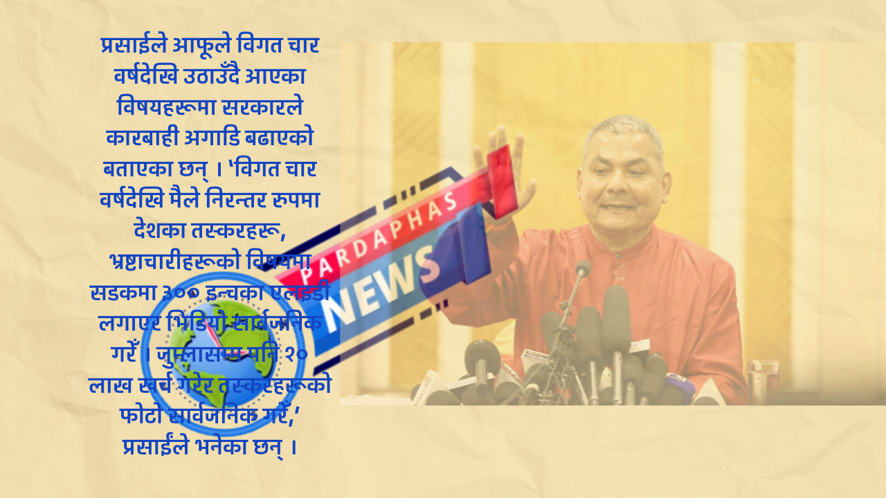 आज (शनिबार) भिडिओ सन्देश जारी गर्दै प्रसाईले आफूले विगत चार वर्षदेखि उठाउँदै आएका विषयहरूमा सरकारले कारबाही अगाडि बढाएको बताएका छन् । ‘विगत चार वर्षदेखि मैले निरन्तर रुपमा देशका तस्करहरू, भ्रष्टाचारीहरूको विषयमा सडकमा ३०० इन्चका एलइडी लगाएर भिडियो सार्वजनिक गरेँ । जुम्लासम्म पनि १० लाख खर्च गरेर तस्करहरूको फोटो सार्वजनिक गरेँ,’ प्रसाईंले भनेका छन् ।