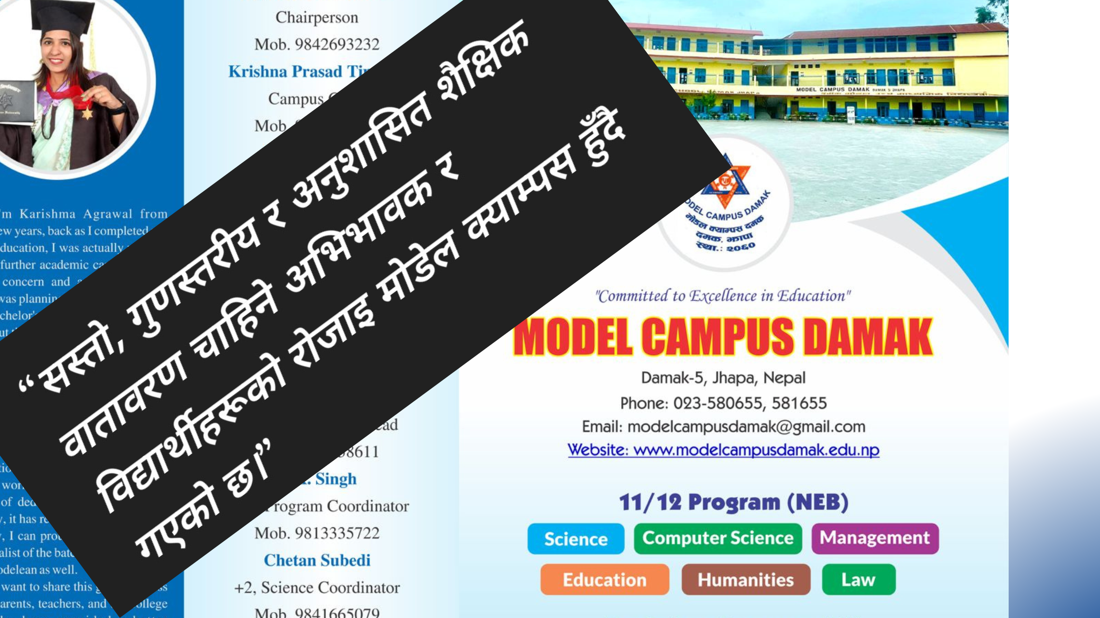 यदि तपाईं आफ्ना सन्तानलाई उपयुक्त शैक्षिक संस्था खोज्दै हुनुहुन्छ भने मोडेल क्याम्पस दमक–५, झापा एउटा उत्कृष्ट विकल्प बन्न सक्छ। थप जानकारीका लागि ०२३–५८०६५५ वा ०२३–५८१६५५ मा सम्पर्क गर्न सकिन्छ।