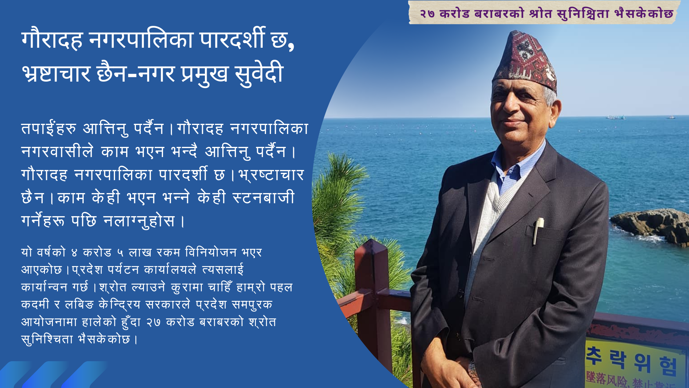 आगामी योजना भन्नाले तिनै हुन।यिनै समग्र योजनालाई पार लाउने।२०८४ पछि गौरादहमा एक प्रकारको चाहिँ परिवर्तन नै ल्याउने योजना हो। २०८४ भन्दा अगाडि नै परिवर्तन हो, हाम्रो।