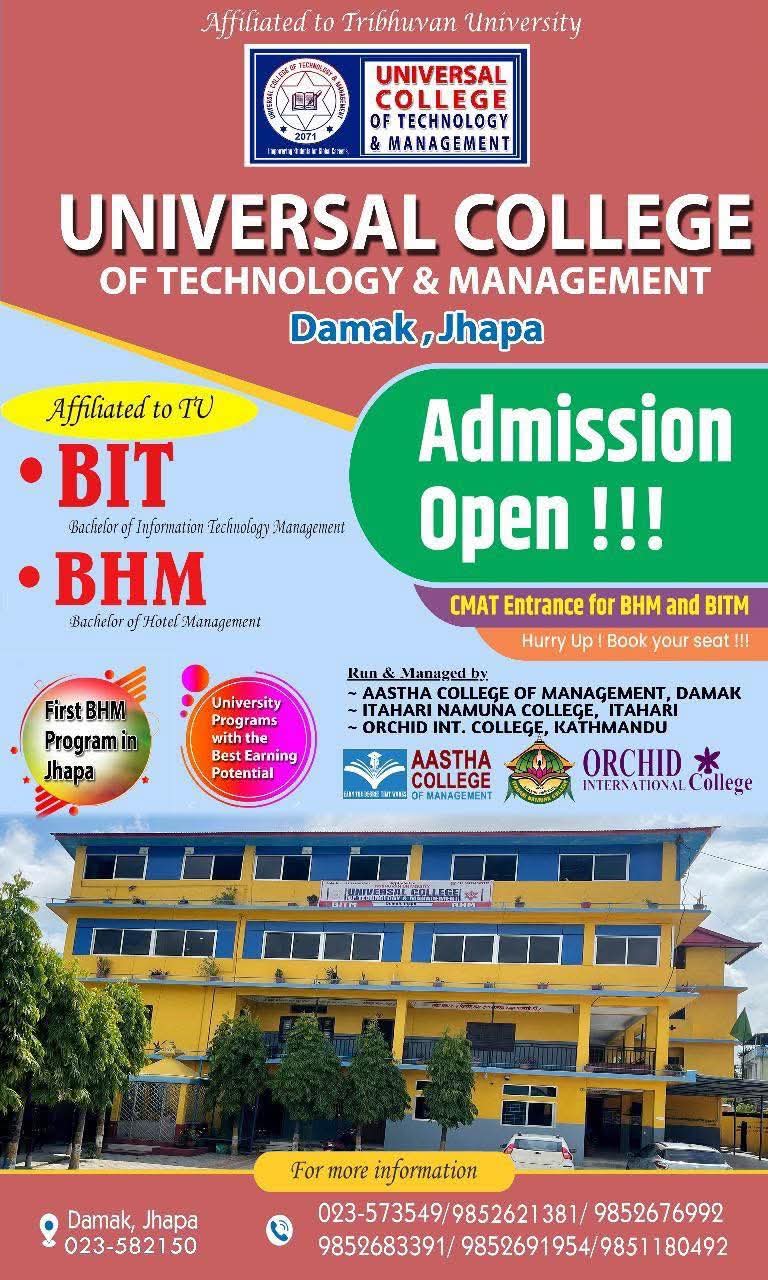 विगत लामो समय देखि दमकमा स्नातक स्तरको प्राविधिक तथा सिप मुलक शिक्षा प्रदान गर्दै आएको आस्था कलेज अफ मेनेजमेन्टले आम अभिभावक र विद्यार्थीहरुको आवश्यकतालाई मध्यनजर गर्दै चालु शैक्षिक सत्र देखि आस्था कलेज दमक, नमुना कलेज इटहरी, अर्किड इस्टरनेशनल कलेज काठमाडौंको संयुक्त व्यवस्थापनमा युनिर्भसल कलेज अफ टेक्नोलोजि एण्ड मेनेजमेन्ट संचालनमा ल्याएको आज आस्था कलेज अफ मेनेजमेन्ट कलेज दमकले पत्रकार सम्मेलन गरी जानकारी गराएको हो ।