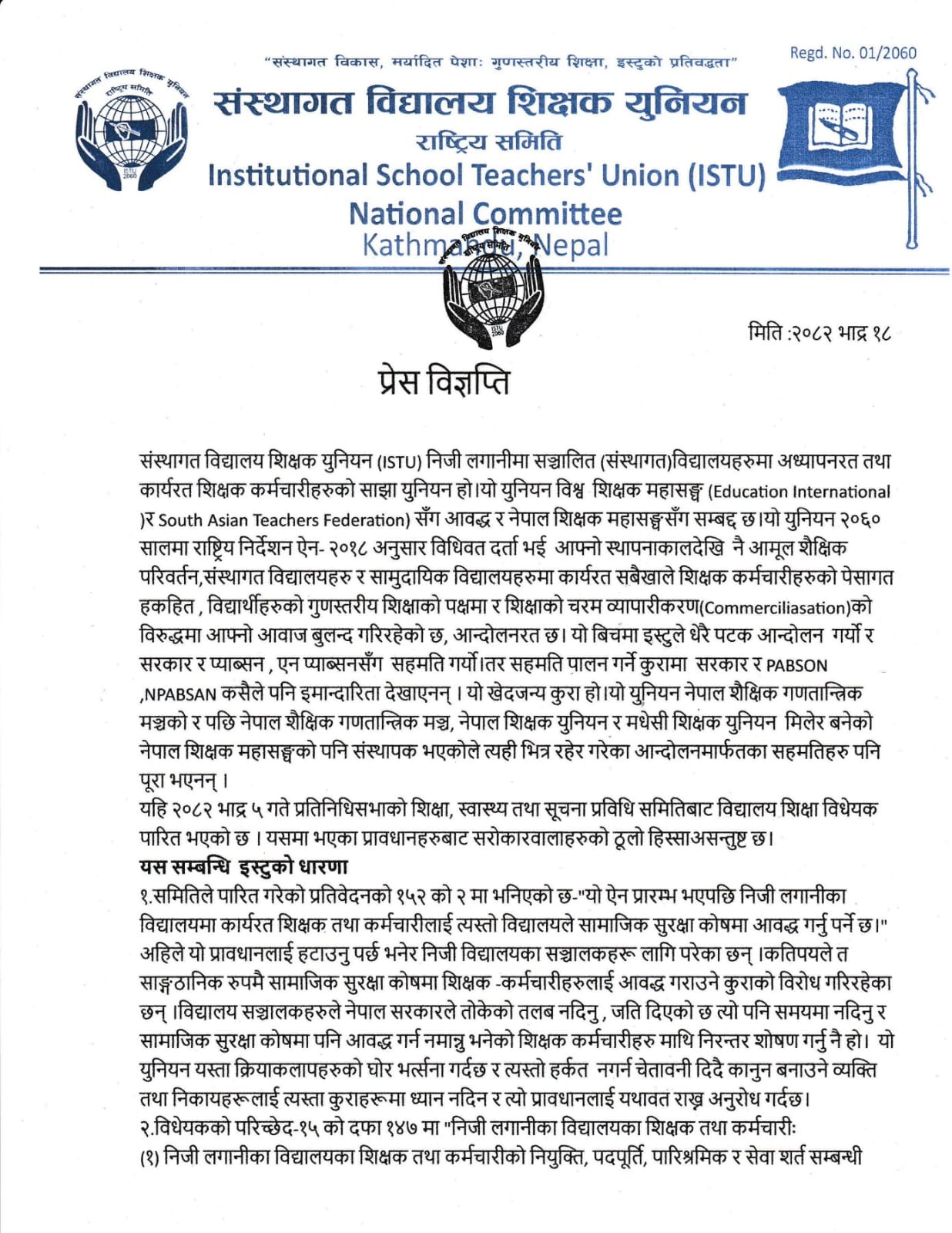 युनियनका महासचिव भूपाल उप्रेती र अध्यक्ष होमकुमार थापाद्वारा जारी विज्ञप्तिमा निजी विद्यालयका सञ्चालकहरूले सामाजिक सुरक्षा कोषमा शिक्षक–कर्मचारीलाई आबद्ध गराउने प्रावधानलाई विरोध गर्नु दुखद रहेको उल्लेख गरिएको छ। विज्ञप्तिमा भनिएको छ, “विद्यालय सञ्चालकहरूले सरकारले तोकेको तलब समयमा नदिनु, सामाजिक सुरक्षा कोषमा आबद्ध गर्न नमानेर निरन्तर शोषण गर्नु निन्दनीय छ।”