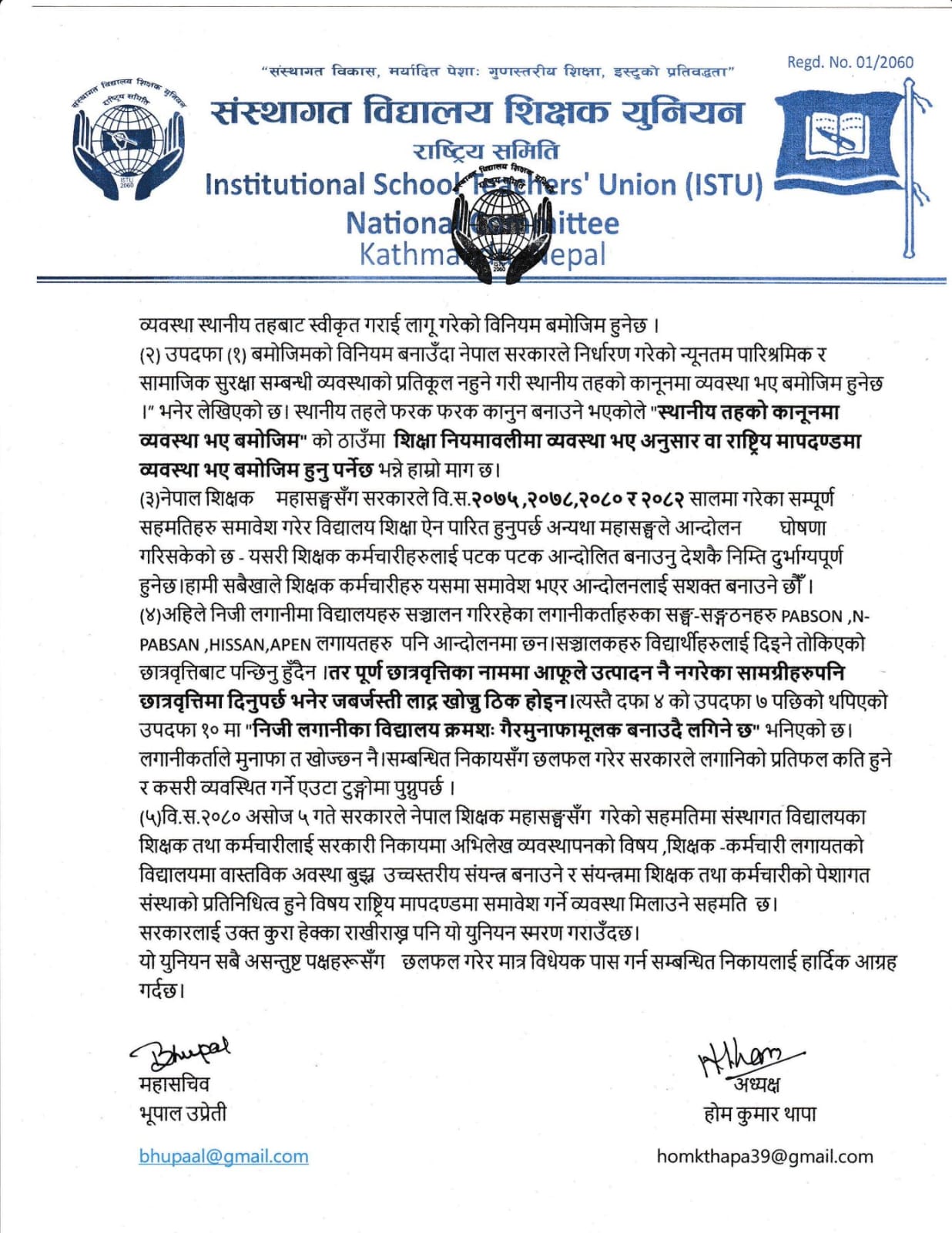 संस्थागत विद्यालय शिक्षक युनियन (ISTU) ले प्रतिनिधिसभाको शिक्षा, स्वास्थ्य तथा सूचना प्रविधि समितिबाट पारित विद्यालय शिक्षा विधेयकप्रति असन्तुष्टि जनाउँदै केही प्रावधानहरु संशोधन गर्न आग्रह गरेको छ।