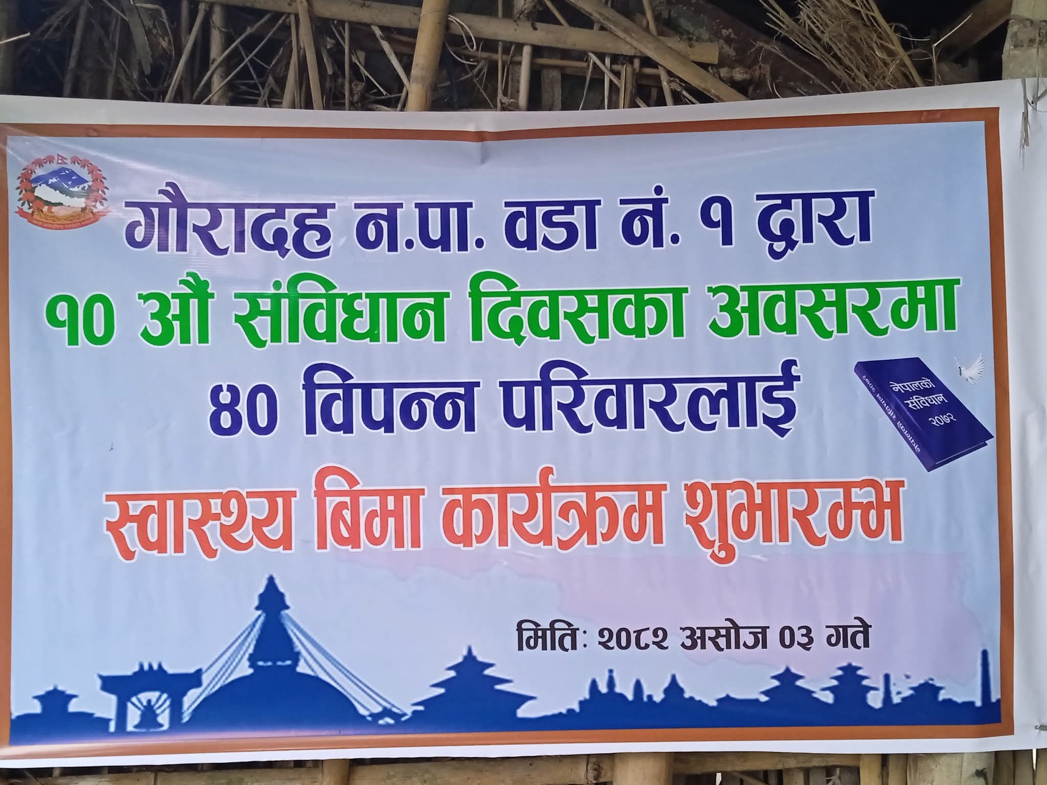 झापा, ३ असोज । संविधान दिवसको अवसर पारेर गौरादह नगरपालिका–१ मा दीर्घ रोगबाट पीडित विपन्न परिवारलाई स्वास्थ्य बीमा कार्यक्रम सुरु गरिएको छ।